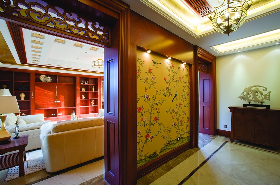 蘇州嬌古蘇繡在風格上彰顯中式文化的輝煌大氣,高貴典雅,進一步用外在之美,表現出古老蘇繡的文化內涵,當我們走進蘇繡裝飾的空間,古韻木香,一針一線的刺繡作品,雕花隔斷和室內的頂光交相輝映,水池之中,綠荷搖曳,清秀翠芳,讓人們在感受蘇繡奢華風格的同時,再次體會到刺繡工藝文化的精髓。
