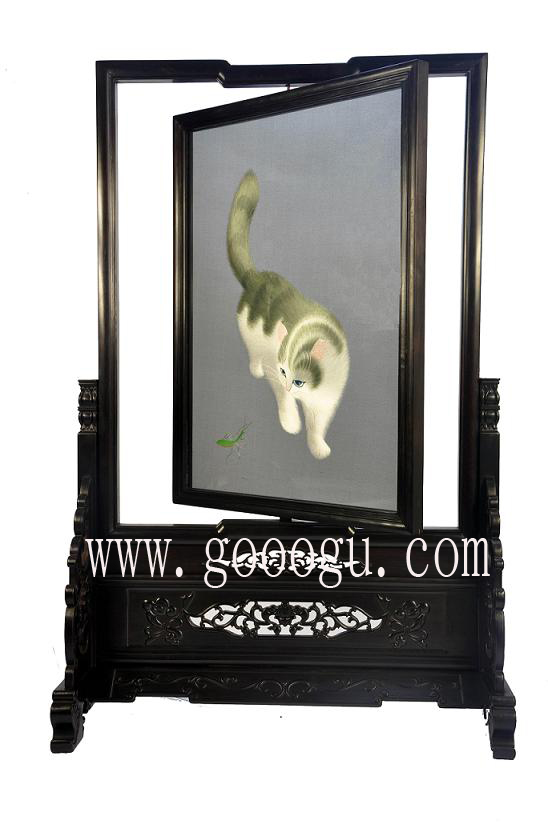 走進嬌古蘇繡的展廳,我們驚嘆于陳列室里作品的浩繁與精致,先來看傳統題材的作品?;B繡是蘇繡傳統產品,它是明清時期閨閣繡的延續。蘇繡工藝品《小 貓》、《金魚》曾在國際上得獎,《小貓》的名氣在于貓眼用二十六種不同顏色的絲線繡成;《金魚》的輝煌則是魚尾最細處僅用一根線的四十八分之一。蘇州各大 旅游景點也屢見小貓金魚的姿態,如何擺脫蘇繡工藝品的匠氣,使俗氣的工藝品成為震撼人心的藝術品,這是嬌古蘇繡多年來苦苦研究的問題???,這幅現代 刺繡藝術品《貓》。同樣是貓,傳統的貓講究具體,形象,栩栩如生。而我們面前的兩幅《貓》:一幅白底白貓,一幅黑底黑貓。貓在哪里?貓在白色里,貓在黑色 里,貓在你無盡的想像里。想像之上,具象已與抽象結合起來,達到了藝術升華。同是蘇繡作品,構思變了,功底卻不改,《貓》作品之外給人的聯想可謂余音裊裊。 |