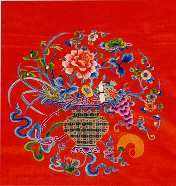清代光緒“紅緞繡五彩花籃紋桌帷料”。此桌帷以紅色緞為面料,在紅色緞面料上,以綠、藍、白、紅、黃為主色調,18種彩色絨線及捻金線為繡線,運用2-5潤色法,采用齊針、散套針、正戧針、打籽針、松針、雞毛針、緝線、網繡、滾針、平金、刻鱗等針法,繡制寓意“連富貴三多”之意的蘭花、牡丹、梅花、石榴、葡萄等花卉紋,均插在花籃里,在花籃的穗上系有蝙蝠、壽桃,組成花籃式團形圖案。此桌帷尤其是用網格技巧繡花籃,用滾針繡花籃的穗,用正戧針繡葡萄、牡丹花瓣等,使花紋形態生動而逼真,活潑而具有生氣。 |