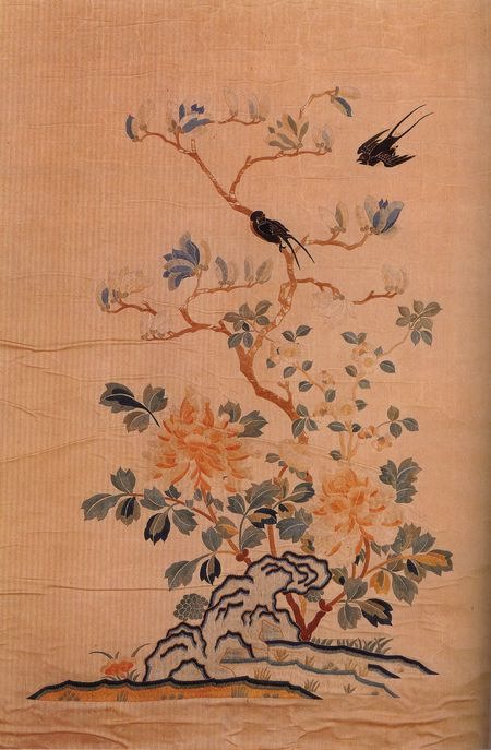 蘇繡有著悠久的歷史和文化,是華夏文明中一顆璀璨的明珠。蘇繡發源于古老的蘇州吳縣一帶,已有上千年的時間,蘇繡在明清時期發展迅速,北京故宮博物院藏清代乾隆時期“白綾繡五彩玉堂富貴圖”。此圖以白色綾為底襯,在白色綾底襯上,以藍、綠、紅、白、黃、黑為主色調,19種彩色絨線及捻金線為繡線,運用2-3配色發,采取正戧針、齊針、刻鱗針、松針、雞毛針、散套針、平針等針藝技巧,繡制寓意“玉堂富貴”、“靈仙祝壽”之意的牡丹、玉蘭、海棠、太湖石、靈芝、春燕紋飾。此圖由于采用正戧針繡牡丹的葉、花及玉蘭、海棠花、用雞毛針繡海棠葉,用齊針繡牡丹、玉蘭、海棠的枝干,使花紋姿態優美,形象生動,栩栩如生,生機盎然,富有極強的立體感和裝飾效果