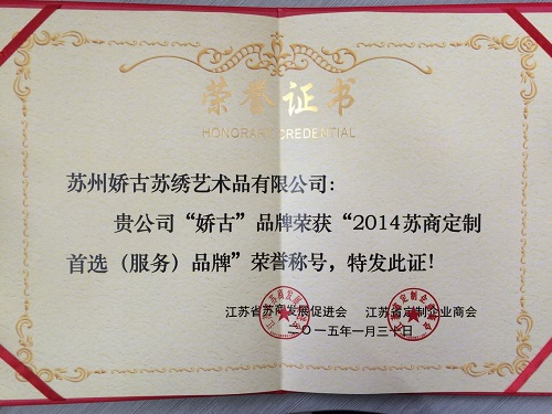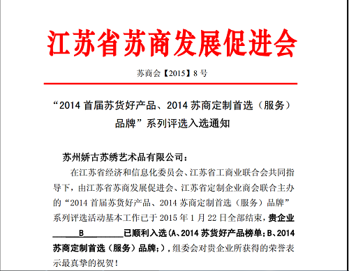 在江蘇省定制企業(yè)商會(huì)副會(huì)長(zhǎng)兼秘書(shū)長(zhǎng)俞文勤的主持下,蘇貨好產(chǎn)品百?gòu)?qiáng)榜單當(dāng)天發(fā)布,嬌古蘇繡藝術(shù)品有限公司的產(chǎn)品在經(jīng)過(guò)專家組的層層選拔之后脫穎而出,獲得2014蘇商定制(服務(wù))品牌榮譽(yù)稱號(hào),它們是江蘇制造的震撼力量,也是鮮活具體的蘇貨映像。大會(huì)還啟動(dòng)了2015蘇貨網(wǎng)上行工程,邁出了蘇貨借助互聯(lián)網(wǎng)平臺(tái)搭建一場(chǎng)永不落幕的展銷(xiāo)會(huì)的實(shí)質(zhì)性一歩。 |