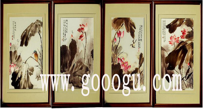 荷花風情四件套裝蘇繡畫|手工藝裝飾畫|傳統居家畫