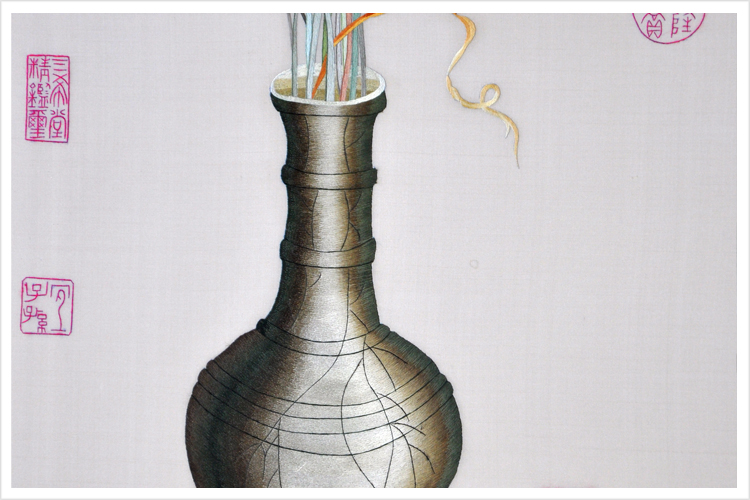 (蘇繡小知識:1根蘇繡絲線可分為16絲,中檔刺繡皆為10絲所繡,中高檔刺繡皆為6-8絲,高檔刺繡皆為4-6絲,精品刺繡皆為1-4絲)