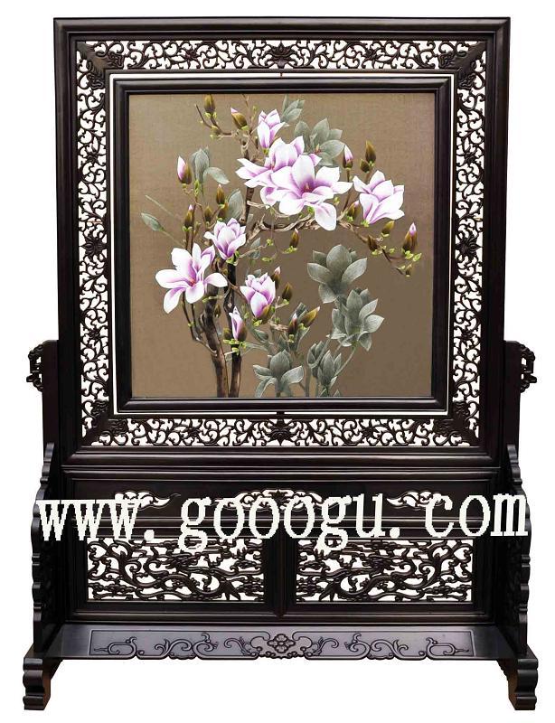 產(chǎn)品材質(zhì):真絲面料+桑蠶絲線+玻璃+紫檀木架